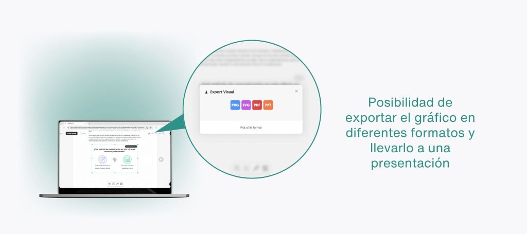 Por otro lado, la herramienta permite la exportación de los gráficos en múltiples formatos (PNG, SVG, PDF o PowerPoint), lo que facilita su incorporación directa a presentaciones, informes o materiales docentes. Esta flexibilidad asegura que los gráficos visuales generados puedan incluirse con facilidad en diferentes documentos del día a día profesional, facilitando la comprensión de textos.