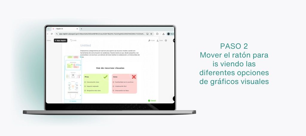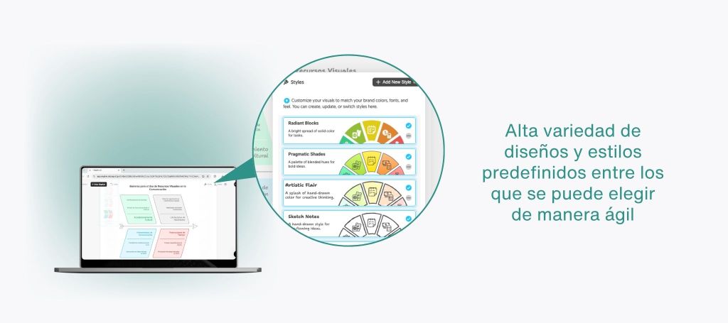 Además de su sencillez para generar gráficos iniciales, Napkin ofrece funcionalidades adicionales que refuerzan su utilidad práctica. Por un lado, dispone de una amplia variedad de diseños y estilos predefinidos, que pueden seleccionarse de manera ágil para adaptar el aspecto visual del diagrama al contexto de uso, desde estilos más sobrios hasta alternativas creativas o tipo “dibujadas a mano”.